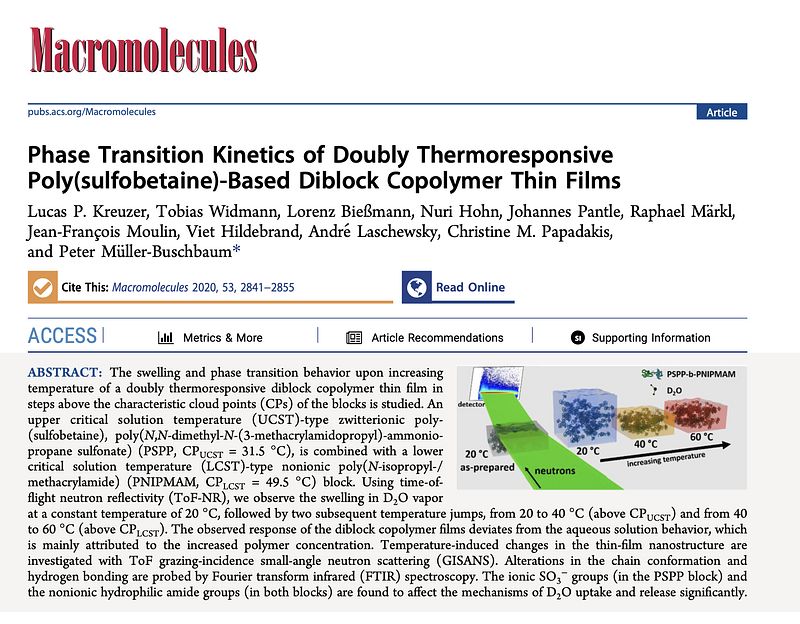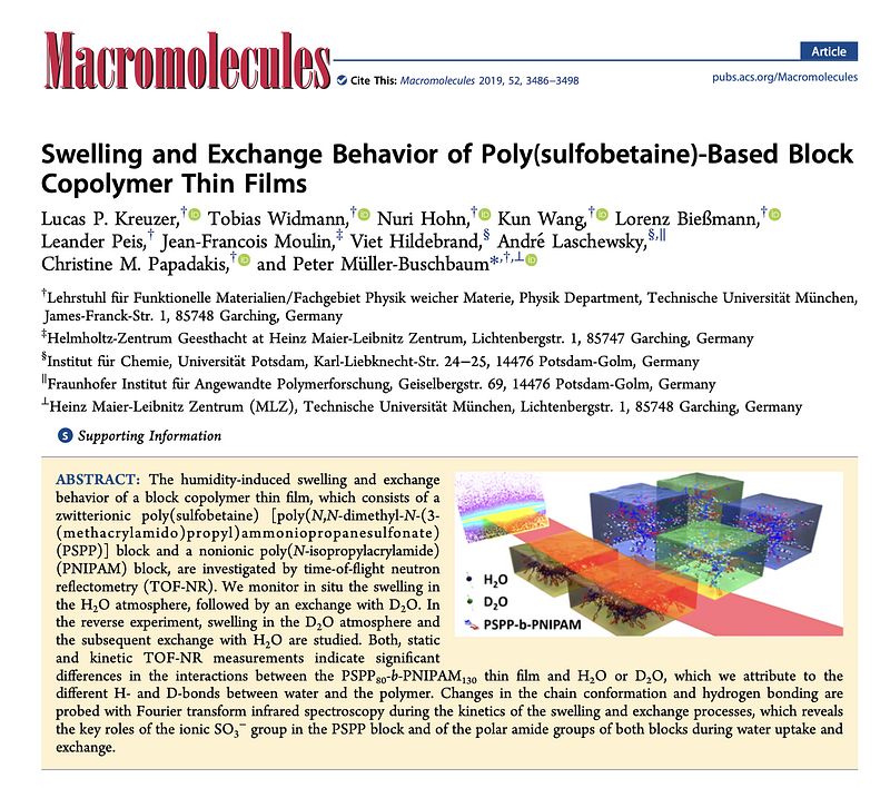 So let's jump right into my very first project (do you remember the beamtime during my first week?). These experiments were about the swelling behavior of PSB-b-PNIPAM thin films in water vapor. The trick here was, that the water vapor was either H2O or D2O vapor. Since the PSB block is sensitive to different water species, we expected a different thin film behavior in different water vapors. In a second step, we exchanged the water vapor, i.e., the H2O became a D2O vapor and vice versa. In this way, we could investigate the exchange behavior. Eventually, this work was published in Macromolecules. It was in the middle of the night in Bangkok, when I got the message that my first first-author paper (as a PhD) got published. I was on vacation and because of the jetlag, I couldn't sleep. When I read the email (yeah, I checked my emails during vacation...I was a greenhorn back then, and probably I still am 🙃), I couldn't sleep even more so, but we managed to celebrate a bit during breakfast a couple of hours later! It's funny, how well I can remember that special moment. Is it the same for you?