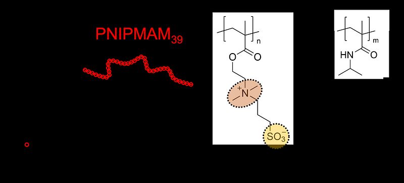 But what makes them really interesting for us, is their special solution behavior: While almost all PSBs are insoluble in water at low temperatures (low means room temperature or below), many of them (for example the PSB shown in Figure 1b) become soluble at higher temperature. This is due to the formation of inner salts by the charged groups. As a result, attractive and repulsive interactions are present between and within the individual polymer chains. Eventually, this leads to a hybrid behavior combining features of ionic and nonionic hydrophilicity. This is exemplarily sketched in Figure 2.
