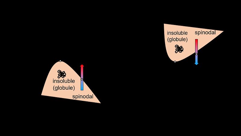 Figure 3: a) UCST- and (b) LCST-type polymers feature a soluble and insoluble phase. The arrows mark the concentration-dependent transitions between the soluble and insoluble phase. CP' and CP indicate the clearing and cloud point. respectively.